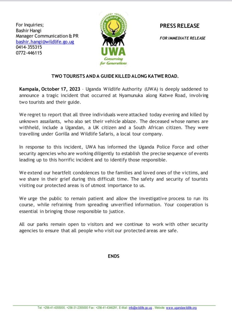 “We have registered a cowardly terrorist attack on two foreign tourists and a Ugandan in Queen Elizabeth National Park. The three were killed, and their safari vehicle burnt. Our joint forces responded immediately upon receiving the information and are aggressively pursuing the suspected ADF rebels. We express our deepest condolences to the families of the victims.,’